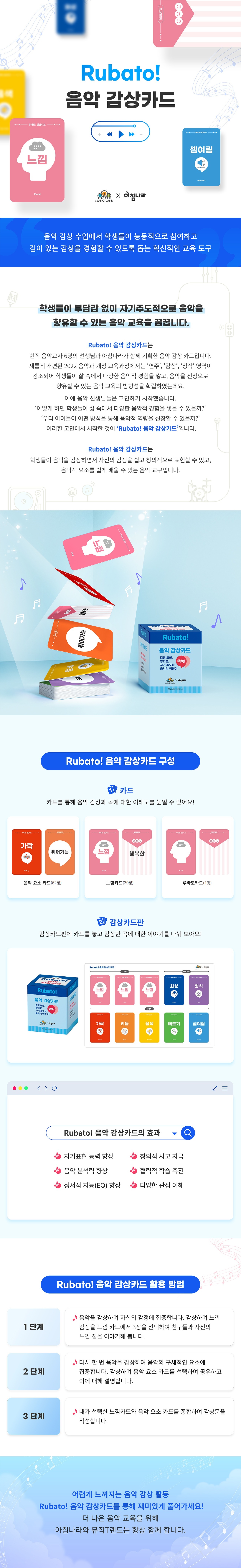 현직 음악교사 6명의 선생님과 아침나라가 함께 기획한 음악 감상카드로, 새로운 2022 음악과 개정 교육과정에 맞춰 학생들이 삶 속에서 다양한 음악적 경험을 쌓고, 음악을 진정으로 향유하면서 창의적인 표현과 함께 음악적 요소를 배울 수 있는 즐거운 음악 교구입니다.
